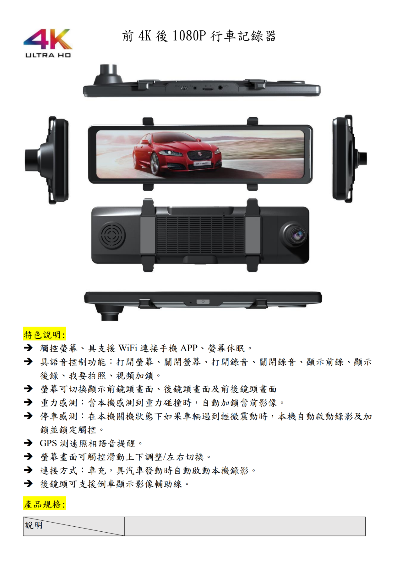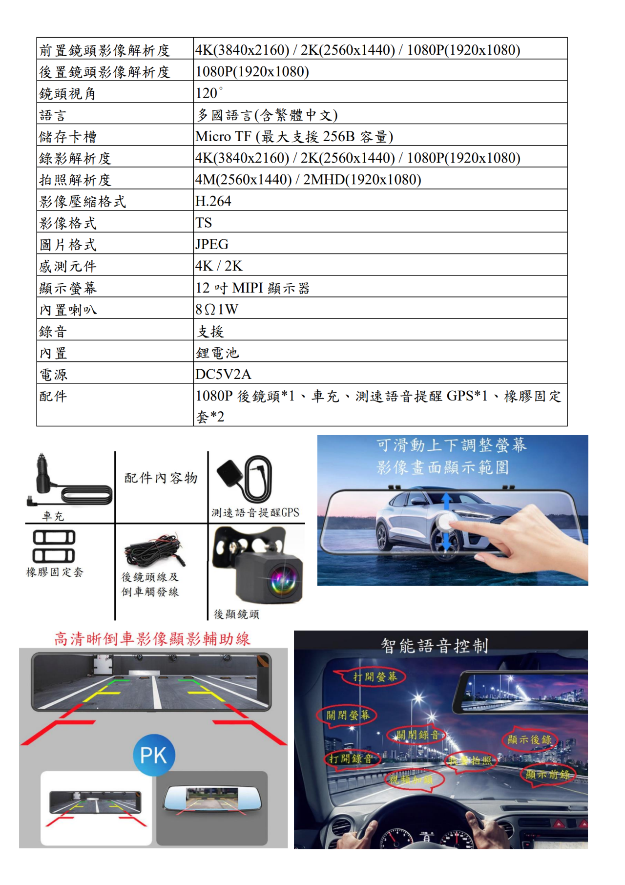 前4K 後1080P 高清 高畫質 12吋 後照鏡 行車紀錄器